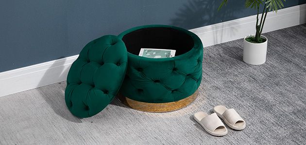HOMCOM Scaun Rotund cu Compartiment de Depozitare din Catifea Verde si Auriu 36x36x45cm