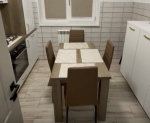 Bucătărie armonioasă cu dulapuri elegante, set de luat masa confortabil, cărucior practic și electrocasnice ce aduc un plus de comoditate.
