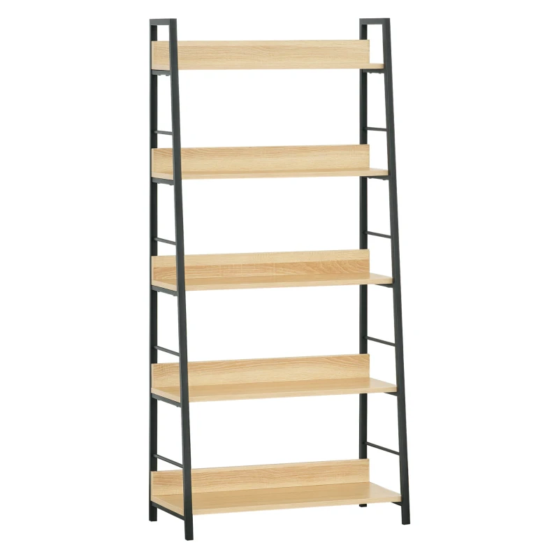 HOMCOM Bibliotecă bibliotecă de stil industrial înclinat 5 Niveluri 70L x 35l x 150H cm Culoare lemn stejar deschis Negru