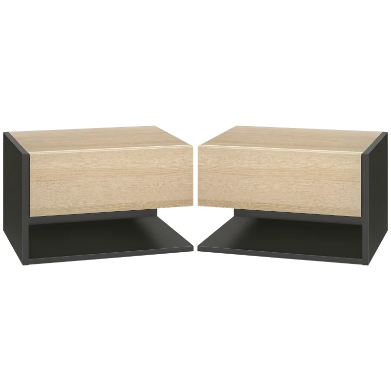 HOMCOM Set de 2 Noptiere suspendate - Set de 2 Noptiere - sertar Culisant, etajera, Bicolore Aspect stejar Negru