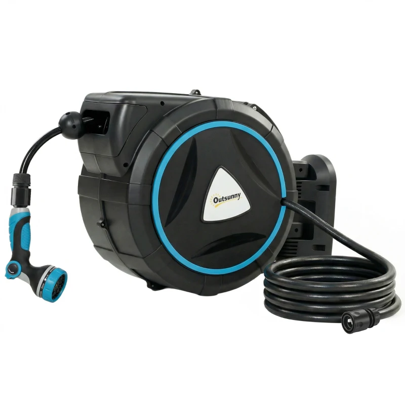 Outsunny Bobină/Tambur Furtun Montat pe Perete Automată 23+2m Tambur Automat Pistol de Udat 10+2 Moduri 55x31x50cm Albastru