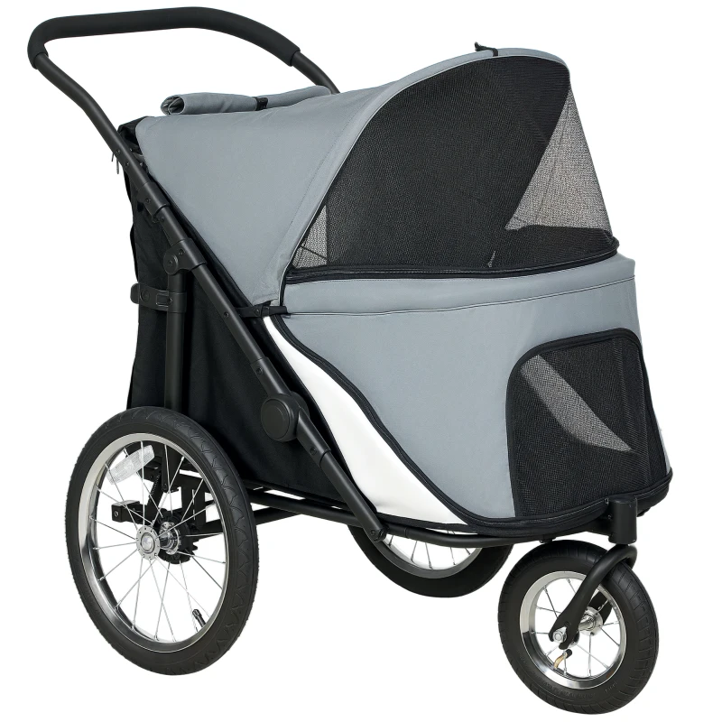 PawHut Cărucior pentru câini 3 roți cu pliere ușoară, buzunar de depozitare, pernă moale, lesă de siguranță, gri(m-3)