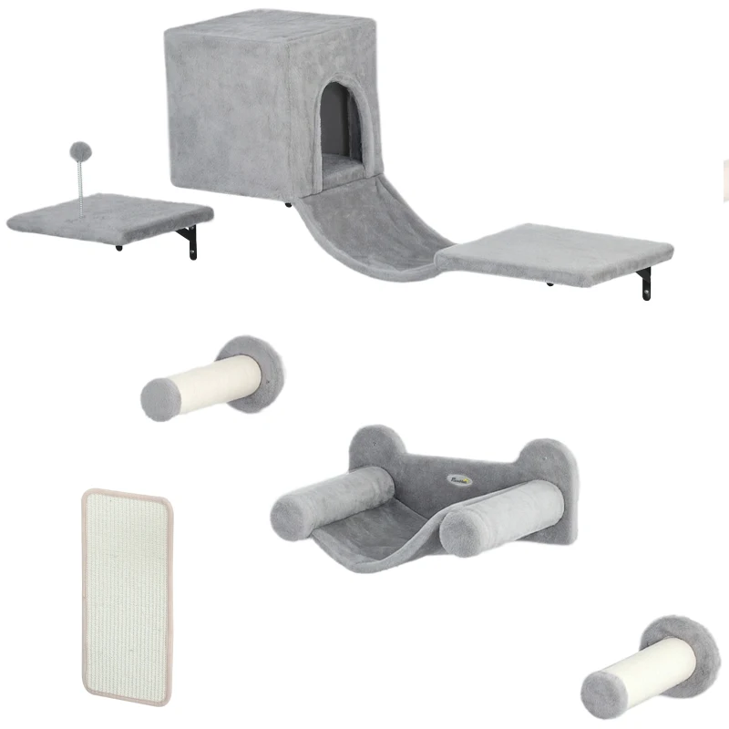 PawHut Perete de cățărat pentru pisici 6 piese set de cățărat cu căsuță pentru pisici, hamac, platformă placă de zgâriat Gri
