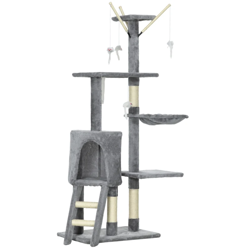 PawHut Ansamblu de joacă pentru pisici cu căsuță, stâlp de ascuțit gheare, platforme și 4 șoricei, 50x35x134.2 cm, gri